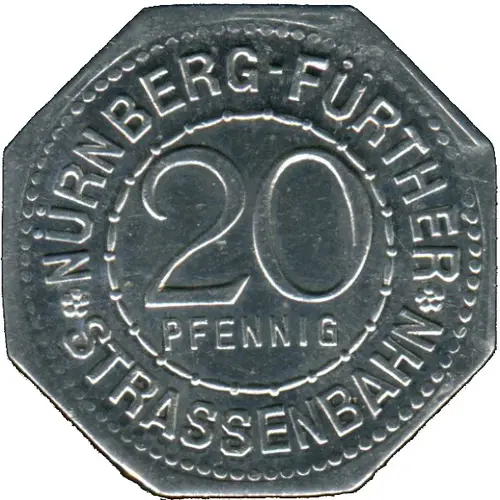 | Opis líce | * NÜRNBERG-FÜRTHER * 20 PFENNIG STRASSENBAHN (Translation: Nuremberg to Furth 20 Pfennig Streetcar Railway) |