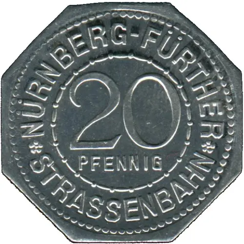| Obverse lettering | * NÜRNBERG-FÜRTHER * 20 PFENNIG STRASSENBAHN (Translation: Nuremberg to Furth 20 Pfennig Streetcar Railway) |