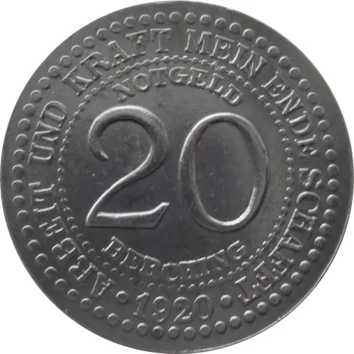 | Obverse lettering | ARBEIT UND KRAFT MEIN ENDE SCHAFFT NOTGELD 20 BERCHING ● 1920 ● |