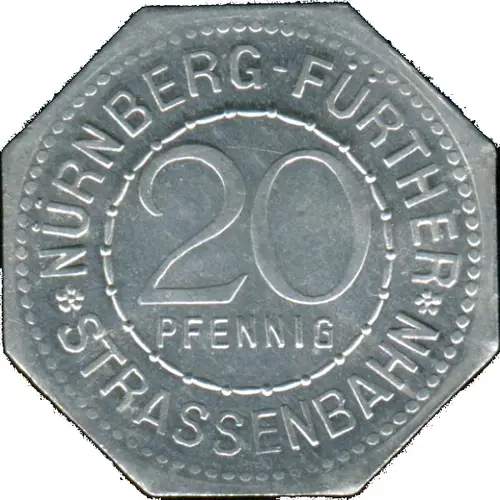 * NÜRNBERG-FÜRTHER * 20 PFENNIG STRASSENBAHN (Translation: Nuremberg to Furth 20 Pfennig Streetcar Railway) |