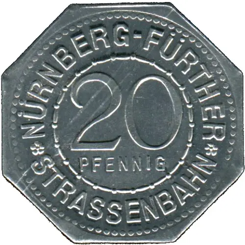 * NÜRNBERG-FÜRTHER * 20 PFENNIG STRASSENBAHN (Translation: Nuremberg to Furth 20 Pfennig Streetcar Railway) |