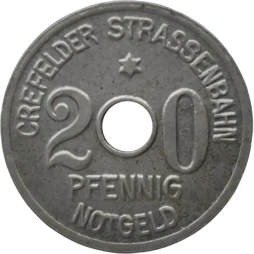 | Obverse lettering | CREFELDER STRASSENBAHN 20 PFENNIG NOTGELD |