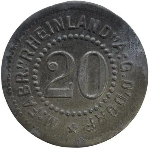 | Obverse lettering | M.- FABR. `RHEINLAND` A.-G. D`DORF ★ 20 |