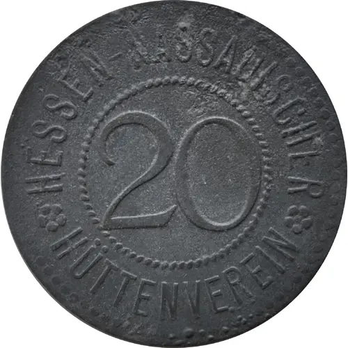 | Obverse lettering | HESSEN-NASSAUISCHER 20 ✿ HÜTTENVEREIN ✿ |
