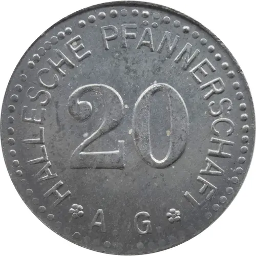 | Obverse lettering | HALLESCHE PFÄNNERSCHAFT 20 ✿ A.G. ✿ |