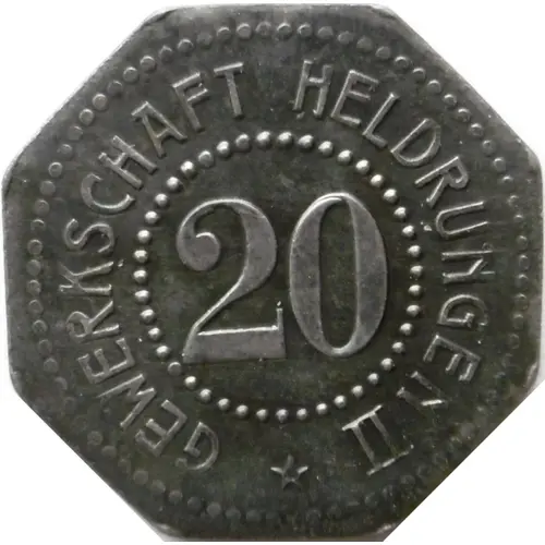 | Obverse lettering | GEWERKSCHAFT HELDRUNGEN II 20 ★ |