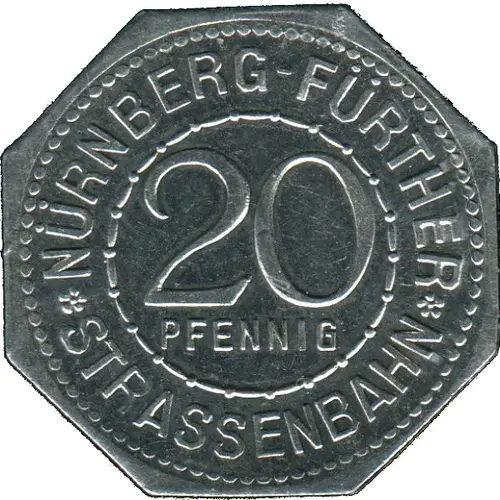 | Надписи аверса | * NÜRNBERG-FÜRTHER * 20 PFENNIG STRASSENBAHN (Translation: Nuremberg to Furth 20 Pfennig Streetcar Railway) |