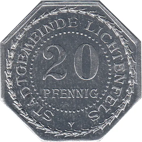 | Obverse lettering | STADTGEMEINDE LICHTENFELS 20 PFENNIG |