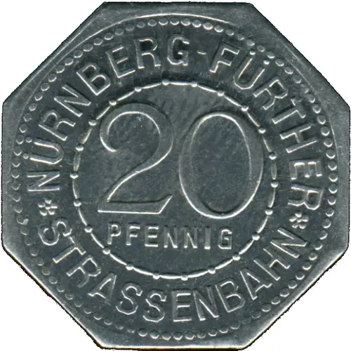 Leyenda del anverso * NÜRNBERG-FÜRTHER * 20 PFENNIG STRASSENBAHN