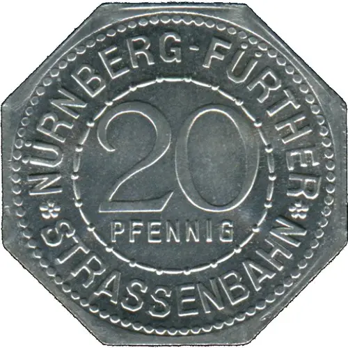 * NÜRNBERG-FÜRTHER * 20 PFENNIG STRASSENBAHN (Translation: Nuremberg to Furth 20 Pfennig Streetcar Railway) |
