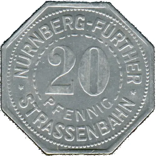 | Obverse lettering | *NÜRNBERG-FÜRTHER* 20 PFENNIG STRASSENBAHN (Translation: Nuremberg to Furth 20 Pfennig Streetcar Railway) |