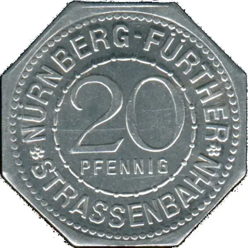 * NÜRNBERG-FÜRTHER * 20 PFENNIG STRASSENBAHN (Translation: Nuremberg to Furth 20 Pfennig Streetcar Railway) |