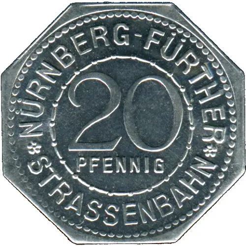 * NÜRNBERG-FÜRTHER * 20 PFENNIG STRASSENBAHN (Translation: Nuremberg to Furth 20 Pfennig Streetcar Railway) |