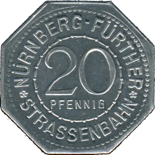 * NÜRNBERG-FÜRTHER * 20 PFENNIG STRASSENBAHN (Translation: Nuremberg to Furth 20 Pfennig Streetcar Railway) |