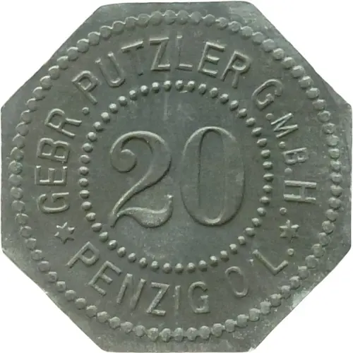 | Obverse lettering | GEBR. PUTZLER G.M.B.H. 20 PENZIG O/L. |