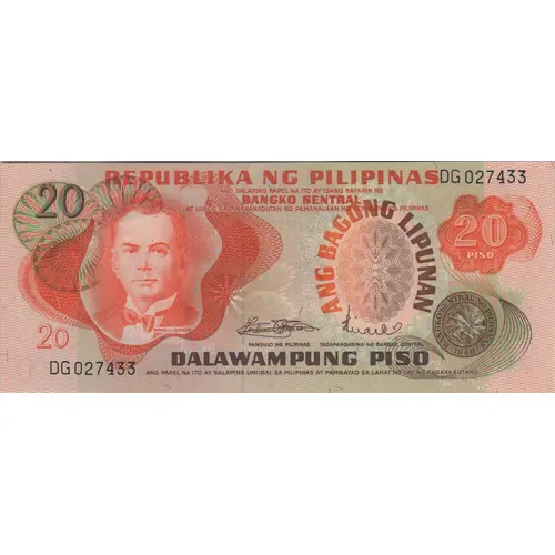 | Obverse lettering | REPUBLIKA NG PILIPINAS ANG SALAPING PAEL NA ITO AY ISANG BAYARIN NG BANGKO SENTRAL AT LUBOS NA PINANANAGUTAN NG PAMAHALAAN NG REPUBLIKA NG PILIPINAS ANG BAGONG LIPUNAN MANUEL L. QUEZON DALAWAMPUNG PISO ANG PAPEL NA ITO AY SALAPING UMIIRAL SA PILIPINAS AT PAMBAYAD SA LAHAT NG URI NG PAGKAKAUTANG MANUEL L. QUEZON (Translation: Republic of the Philippines This note is a liability of the Central Bank and is fully guaranteed by the Government of the Republic of the Philippines The New Society Twenty pesos This note is legal tender in the Philippines and payment to all kind of debt) |