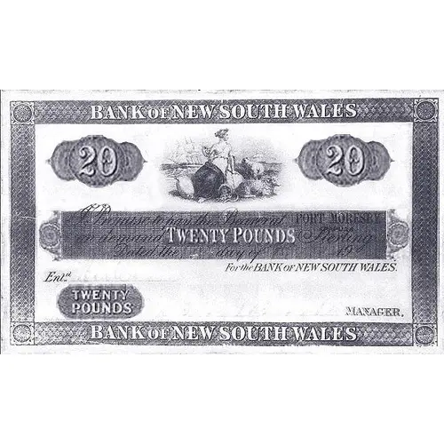 | Obverse lettering | BANK OF NEW SOUTH WALES 20 20 A Promis to pay the Bearer at PORT MORESBY on demand TWENTY POUND Sterling. Dated the ____ day of ____ 19 For the BANK OF NEW SOUTH WALES. TWENTY POUNDS MANAGER BANK OF NEW SOUTH WALES. |
