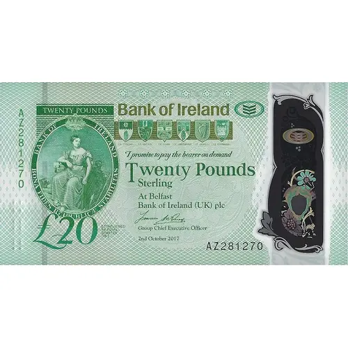 | Obverse lettering | Bank of Ireland I promise to pay the bearer on demand Twenty Pounds Sterling At Belfast Bank of Ireland (UK) plc |