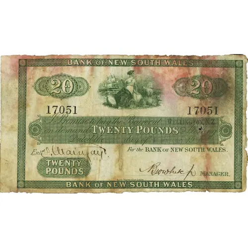 BANK OF NEW SOUTH WALES I PROMISE TO PAY THE BEARER AT WELLINGTON N.Z. ON DEMAND TWENTY POUNDS STERLING FOR THE BANK OF NEW SOUTH WALES TWENTY POUNDS BANK OF NEW SOUTH WALES |