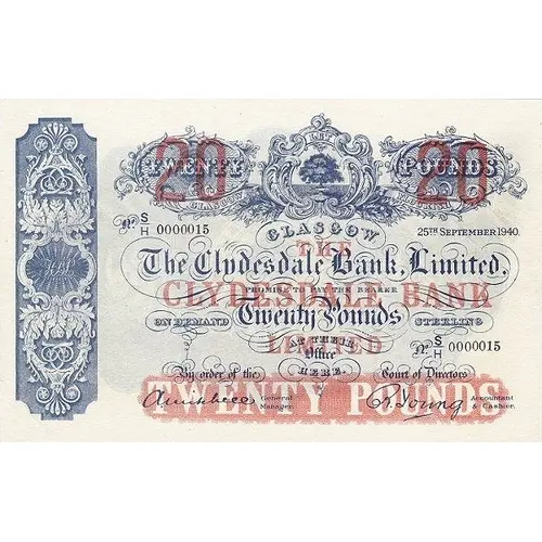 | 正面铭文 | Glasgow The Clydesdale Bank Limited Promise to pay to the Bearer on Demand Twenty Pounds Sterling At their Office here By order of the Court of Directors |