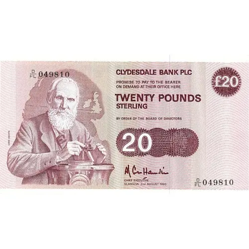 Clydesdale Bank PLC Promise to pay the bearer on demand at their office here Twenty Pounds Sterling by order of the Board of Directors |