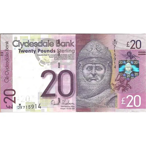 CLYDESDALE BANK TWENTY POUNDS STERLING Clydesdale Bank PLC promise to pay to the Bearer on demand Ten Pounds Sterling at their office here By order of the Board of Directors |