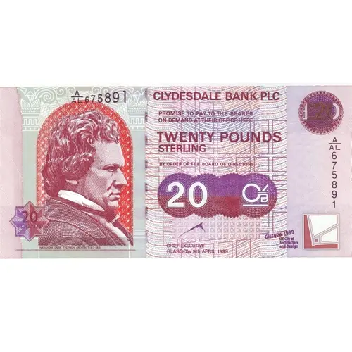 | Obverse lettering | Clydesdale Bank PLC Promise to pay the bearer on demand at their office here Twenty Pounds Sterling by order of the Board of Directors |
