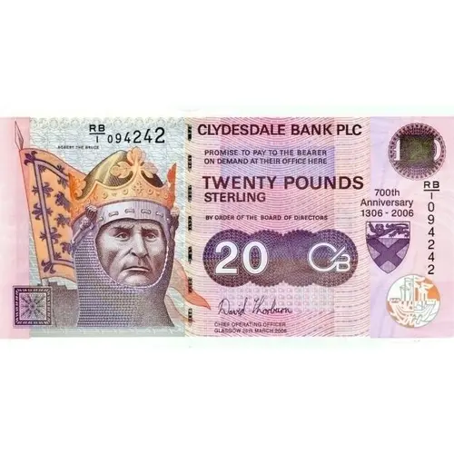 Clydesdale Bank PLC Promise to pay the bearer on demand at their office here Twenty Pounds Sterling by order of the Board of Directors 700th Anniversary 1306-2006 |