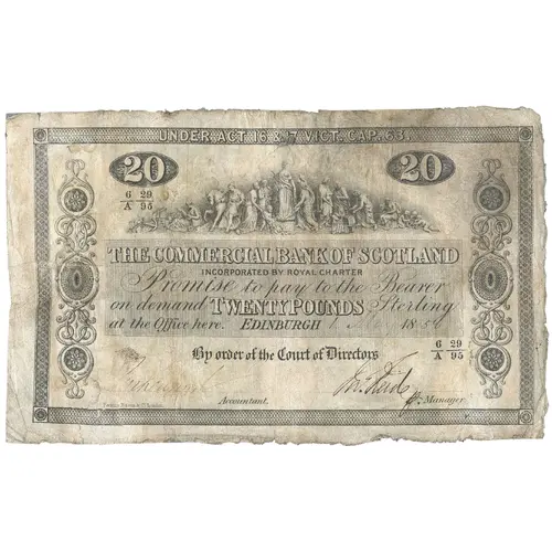 | Legenda del dritto | The Commercial Bank of Scotland Promise to pay the bearer on demand TWENTY POUNDS Sterling at the office here EDINBURGH By order of the Court of Directors |