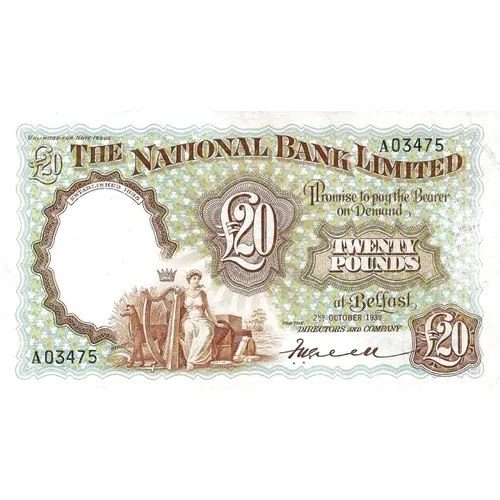 | Obverse lettering | Unlimited for Note Issue Established 1835 The National Bank Limited I Promise to pay the Bearer on Demand Twenty Pounds at Belfast For the Directors and Company |