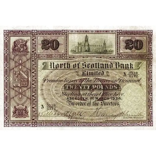 | Obverse lettering | North of Scotland Bank Limited Promise to pay to the Bearer on Demand Twenty Pounds Sterling at their Office here Aberdeen By order of the Directors |