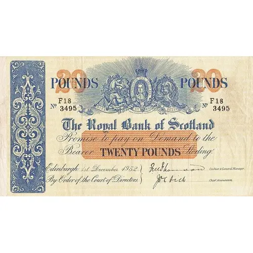 The Royal Bank of Scotland Promise to pay on Demand to the Bearer Twenty Pounds Sterling Edinburgh By order of the Court of Directors |