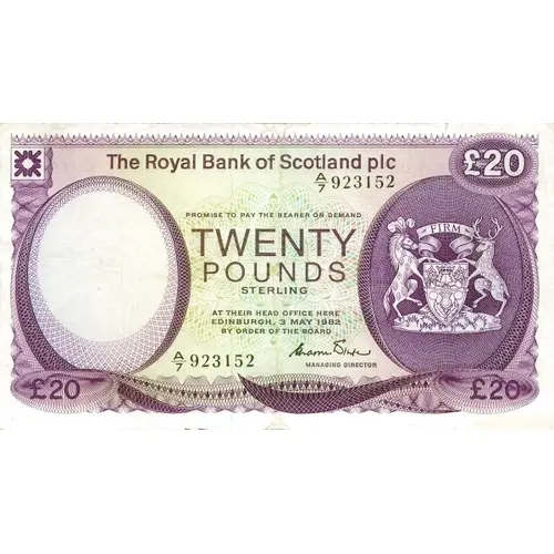 The Royal Bank of Scotland plc Promise to pay the Bearer on Demand Twenty Pounds Sterling At their Head Office here Edinburgh By order of the Board of Directors |