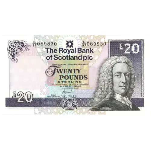 | 正面铭文 | The Royal Bank of Scotland plc Promise to pay the bearer on demand Twenty Pounds Sterling at their head of office here in Edinburgh by order of the board |