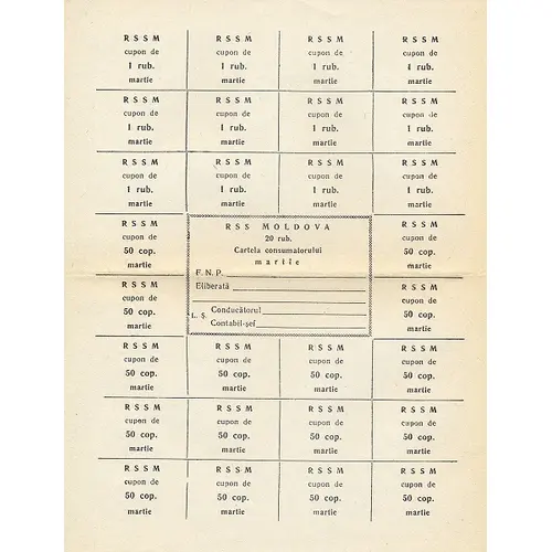 | Obverse lettering | R S S M x12 times cupon de 1 rub. martie R S S MOLDOVA 20 rub. Cartela consumatorului martie F. N. P. ____________ Eliberata __________ __________________ I.S. Conducatorul _____ Contabil-sef ______ R S S M x16 times cupon de 50 cop. martie |
