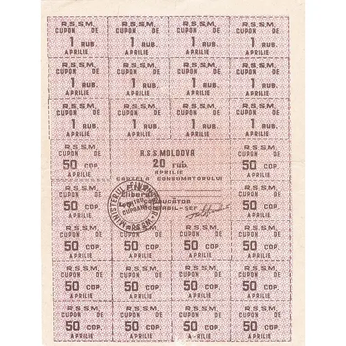 | Obverse lettering | R S S M x12 times CUPON DE 1 RUB. APRILIE R S S MOLDOVA 20 rub. CARTELA CONSUMATORULUI APRILIE F. N. P. ____________ ELIBERATA __________ __________________ I.S. CONDUCATOR_____ CONTABIL-SEF ______ MINISTERUL FINANTELOR PENTRU CUPOANE RSSM R S S M x16 times CUPON DE 50 COP APRILIE |