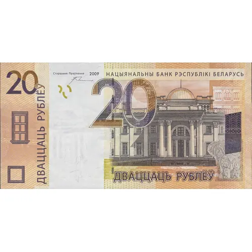 | نوشتههای روی اسکناس | ДВАЦЦАЦЬ РУБЛЁЎ 20 2009 НАЦЫЯНАЛЬНЫ БАНК РЭСПУБЛІКІ БЕЛАРУСЬ ДВАЦЦАЦЬ РУБЛЁЎ (Translation: Twenty Rubles, National Bank of the Republic of Belarus) |