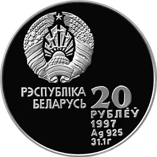 (Translation: REPUBLIC OF BELARUS 20 RUBLES 1997 Ag 925 31.1g)