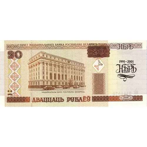 | Obverse lettering | БІЛЕТ НАЦЫЯНАЛЬНАГА БАНКА РЭСПУБЛІКІ БЕЛАРУСЬ НРБР 20 1991-2001 НБРБ НАЦЫЯНАЛЬНЫ БАНК РЭСПУБЛІКІ БЕЛАРУСЬ ДВАЦЦАЦЬ РУБЛЁЎ 2000 (Translation: Payment ticket of the National Bank of the Republic of Belarus, NBRB, National Bank of the Republic of Belarus, Twenty Rubles) |