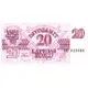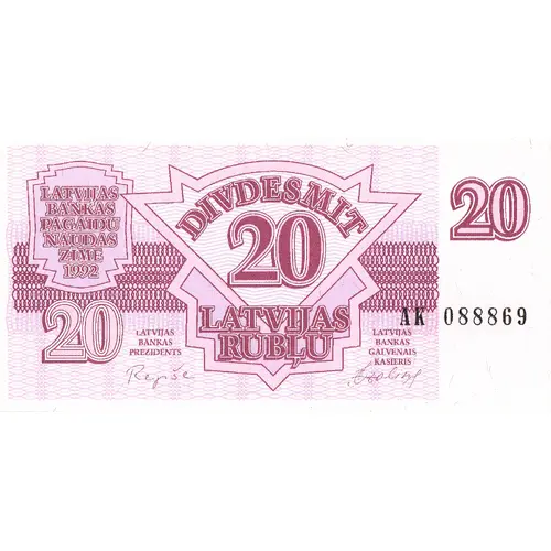 | Obverse lettering | LATVIJAS BANKAS PAGAIDU NAUDAS ZĪME 1992 DIVDESMIT LATVIJAS RUBĻU (Translation: Temporary banknotes of the Bank of Latvia Twenty Latvian Roubles) |
