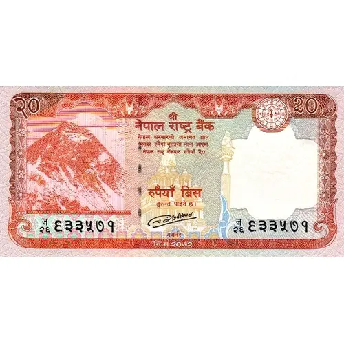 Sambar deer (Rusa unicolor), Himalayan mountains in the background. / Emblem of Rastra Bank of Nepal, ocidental era below. |