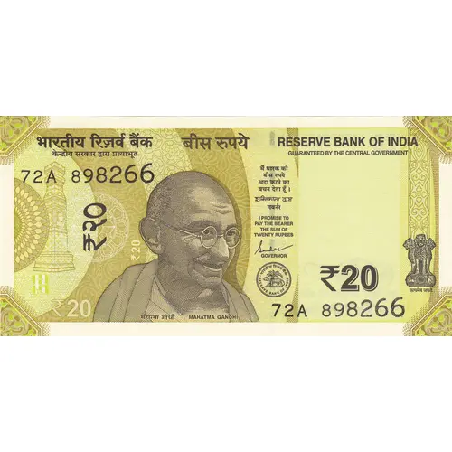 भारतीय रिजर्व बैंक बीस रुपये RESERVE BANK OF INDIA केन्द्रीय सरकार द्वारा निर्देशित थत GUARANTEED BY THE CENTRAL GOVERNMENT मैं धारक को बीस रुपये अदा करने का वचन देता हूँ। राज्यपाल I PROMISE TO PAY THE BEARER THE SUM OF TWENTY RUPEES महात्मा गांधी MAHATMA GANDHI (Translation: Reserve Bank of India Twenty Rupees Reserve Bank of India Guaranteed by the Central Government Guaranteed by the Central Government To the Holder Twenty Rupees To Pay I Promise Governor To the Holder Twenty Rupees To Pay I Promise Governor Mahatma Gandhi Mahatma Gandhi) |