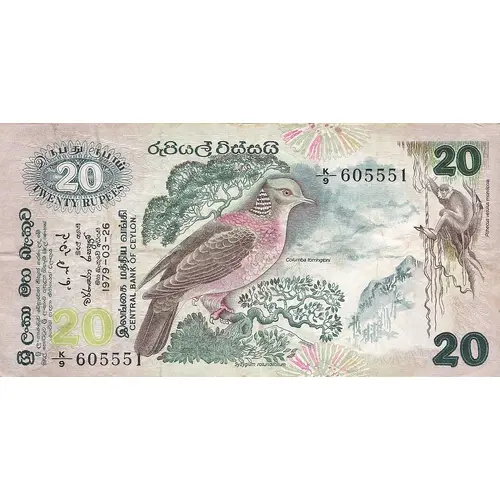 රුපියල් විස්සයි இருபது ரூபாய் TWENTY RUPEES ශ්රී ලංකා මහ බැංකුව ශ්රී ලංකාණ්ඩුව වෙනුවෙන් නිකුත් කරන ලද මේ මුදල් නෝට්ටුව ශ්රී ලංකාව ඇතුළත ඕනෑම මුදල් ගණනක් ගෙවිම සඳහා නිතියෙන් වලංගුය මුදල් ඈමති මහ බැංකුවේ අධිපති 1979–03–26 இலங்கை மத்திய வங்கி CENTRAL BANK OF CEYLON. (Translation: Twenty Rupees Twenty Rupees Central Bank of Sri Lanka Issued on behalf of the Government of Sri Lanka. This currency note is legally valid for payment of any amount within Sri Lanka. {signature of Ronnie de Mel} Finance Minister {signature of Warnasena Rasaputram} Governor of the Central Bank Central Bank of Sri Lanka Central Bank of Ceylon.) |