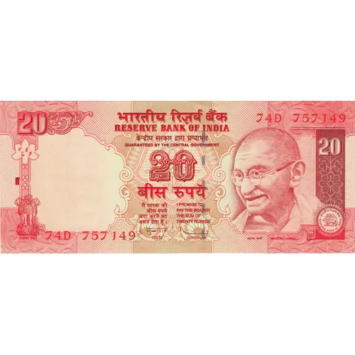 Obverse lettering RESERVE BANK OF INDIA GUARANTEED BY THE CENTRAL GOVERNMENT I PROMISE TO PAY THE BEARER ON DEMAND THE SUM OF TWENTY RUPEES