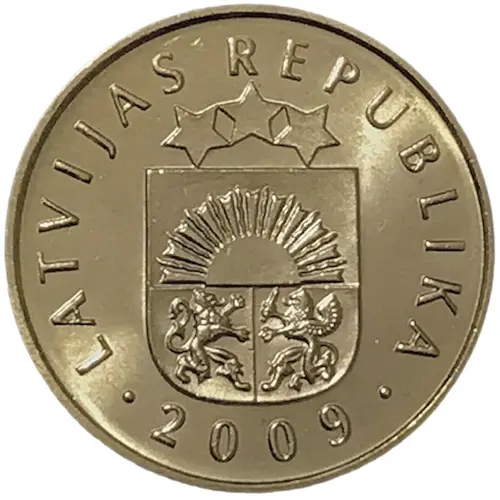 Artistry: The design, consistent with the Lats series developed by artists Gunārs Lūsis and Jānis Strupulis, embodies a modern, nationalistic aesthetic. The obverse proudly displays the Greater Coat of Arms of Latvia, featuring the rising sun, three stars, a lion, and a griffin, symbolizing the nation's history and regions. The reverse presents the denomination "20 SANTĪMU" encircled by a stylized oak branch, a traditional Latvian symbol of strength, longevity, and national identity, with the year of mintage positioned below.