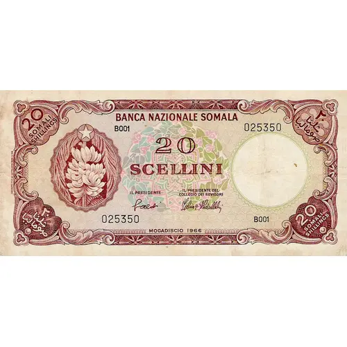 | Obverse lettering | 20 SOMALI SHILLINGS BANCA NAZZIONALE SOMALA 20 SCELLINI MOGADISCIO 20 SOMALI SHILLINGS |