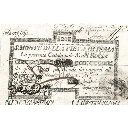 | نوشتههای روی اسکناس | 20 PRIMO MAAGGIO MILLE SETTECENTO NOVANTASETTE S. M. DI PIETA DI ROMA La presente Cedola vaglia Scudi Romani Venti da giulj dieci per Scudo da pagarsi all` Esibitore. |