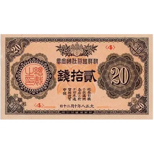 | Legenda do anverso | 票金佛仕行銀鮮朝 銭拾貳 20 日十二 月十 年八正大 (Translation: Joseon Banknote, Twenty Sen 12th October year 8 of Taisho) |