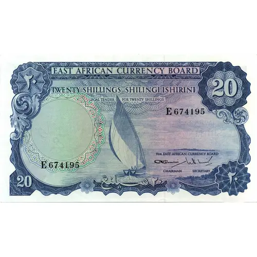 | Legenda do anverso | EAST AFRICAN CURRENCY BOARD TWENTY SHILLINGS SHILINGI ISHIRINI LEGAL TENDER FOR TWENTY SHILLINGS |