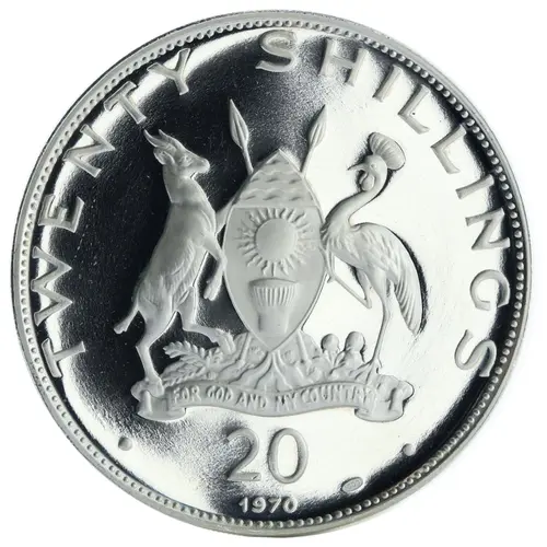 Coat of arms of Uganda. Composition detail at lower right. Dotted circle around the rim. |